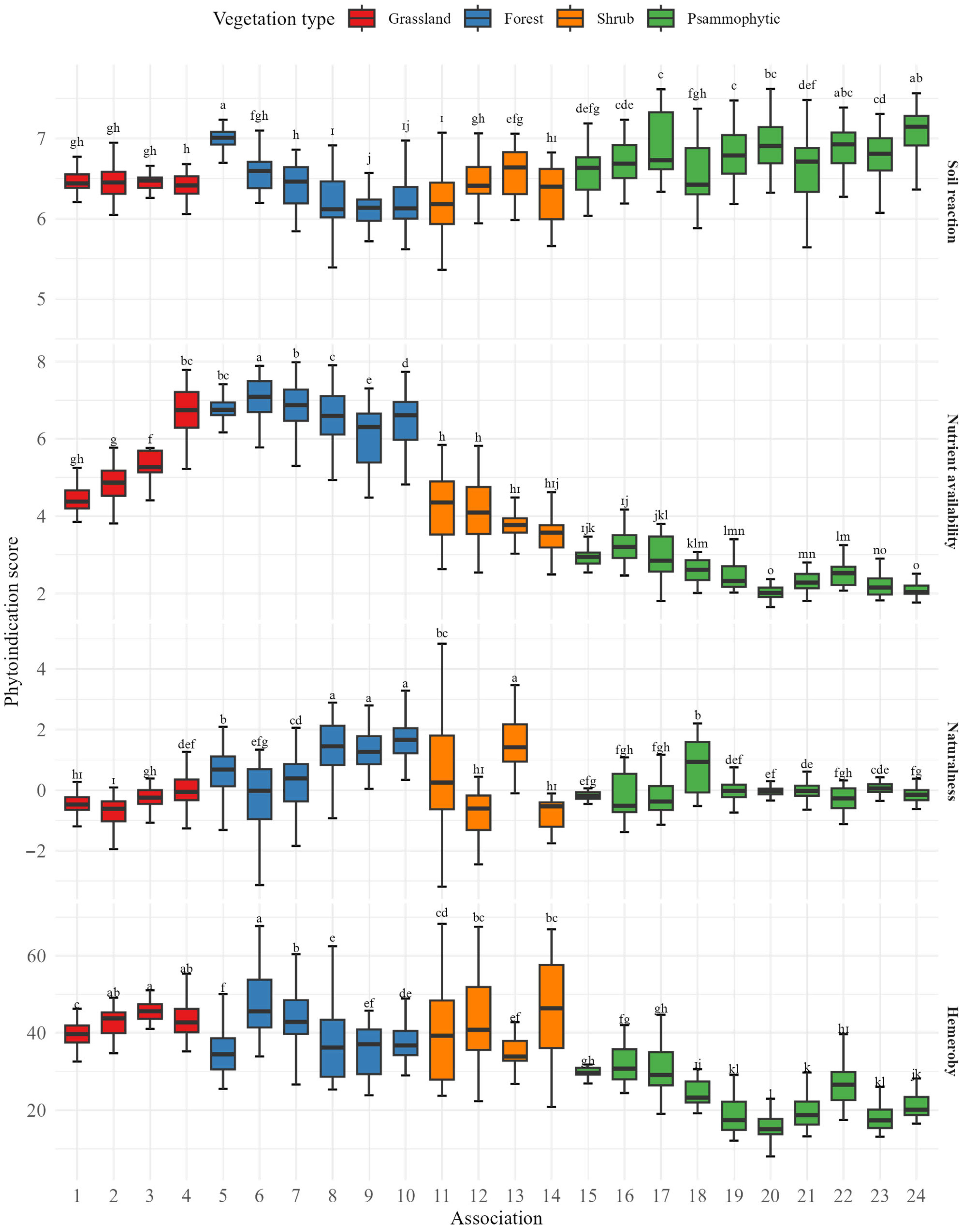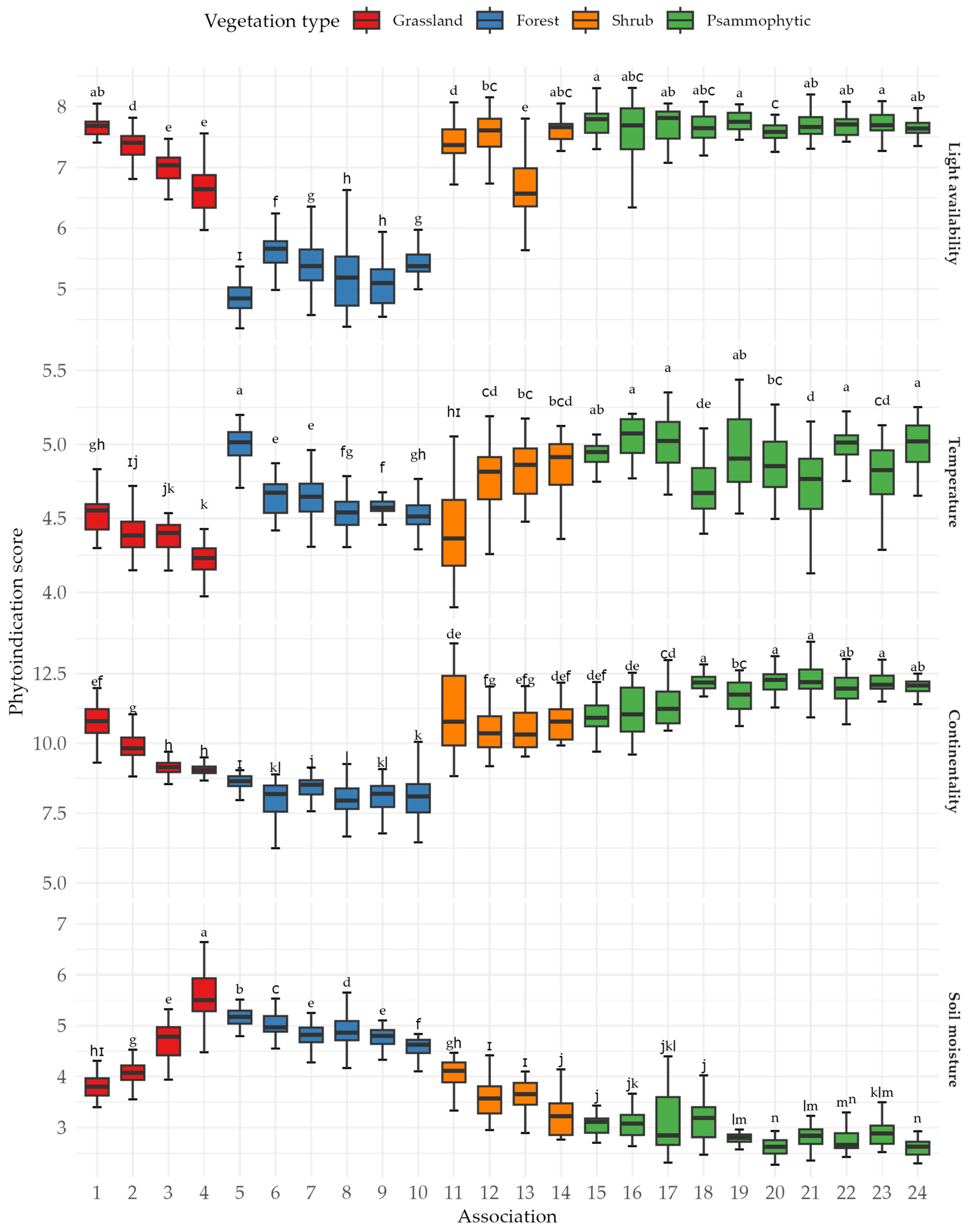 49]. Comparisons with empirical measurements of environmental factors reveal shifts in indicator scores across different phytosociological vegetation classes [