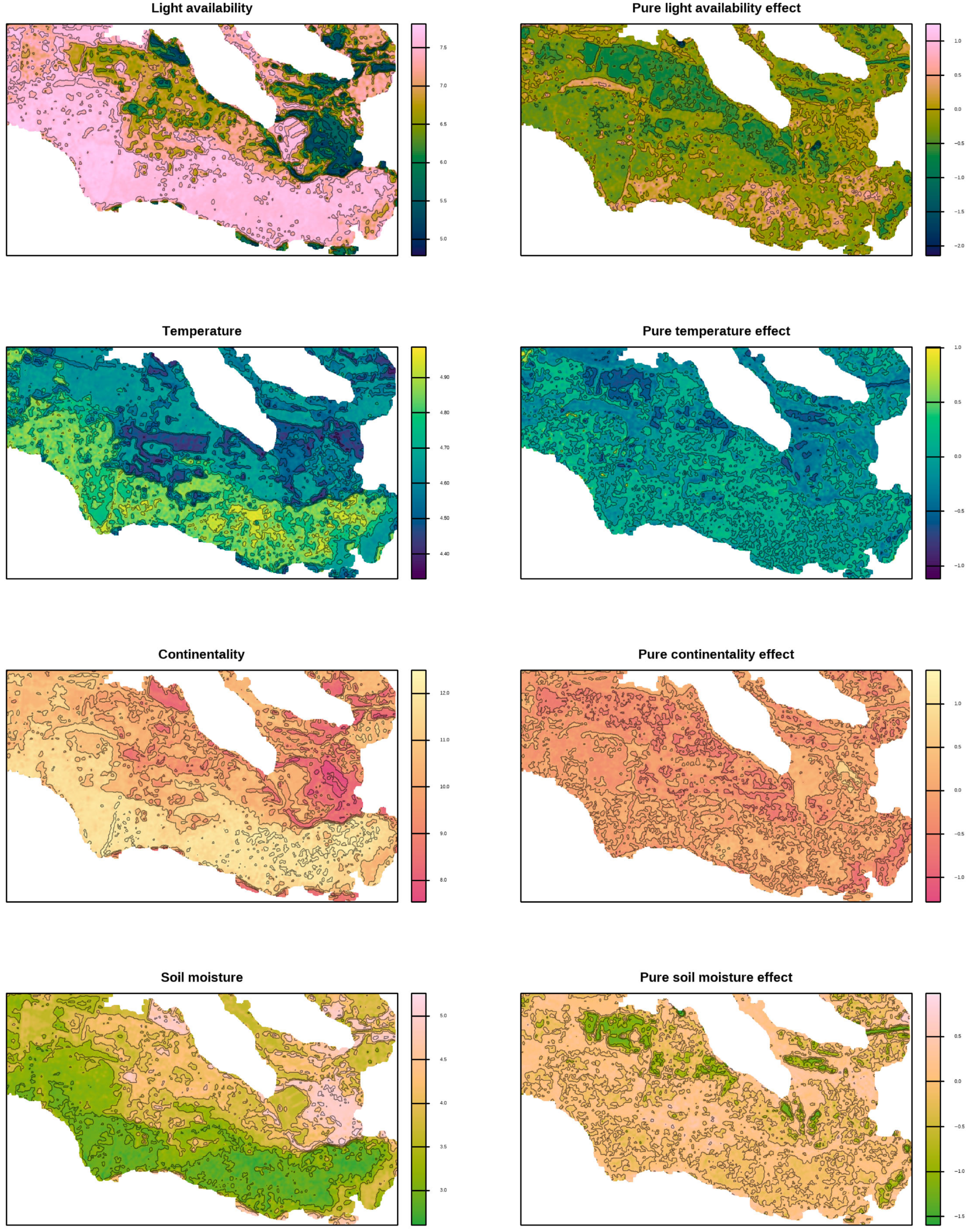 Spatial variability of environmental factors based on the Ellenberg indicator system predicted by a random forest using Sentinel-derived spectral indices (left panel) and their pure effects (right panel).