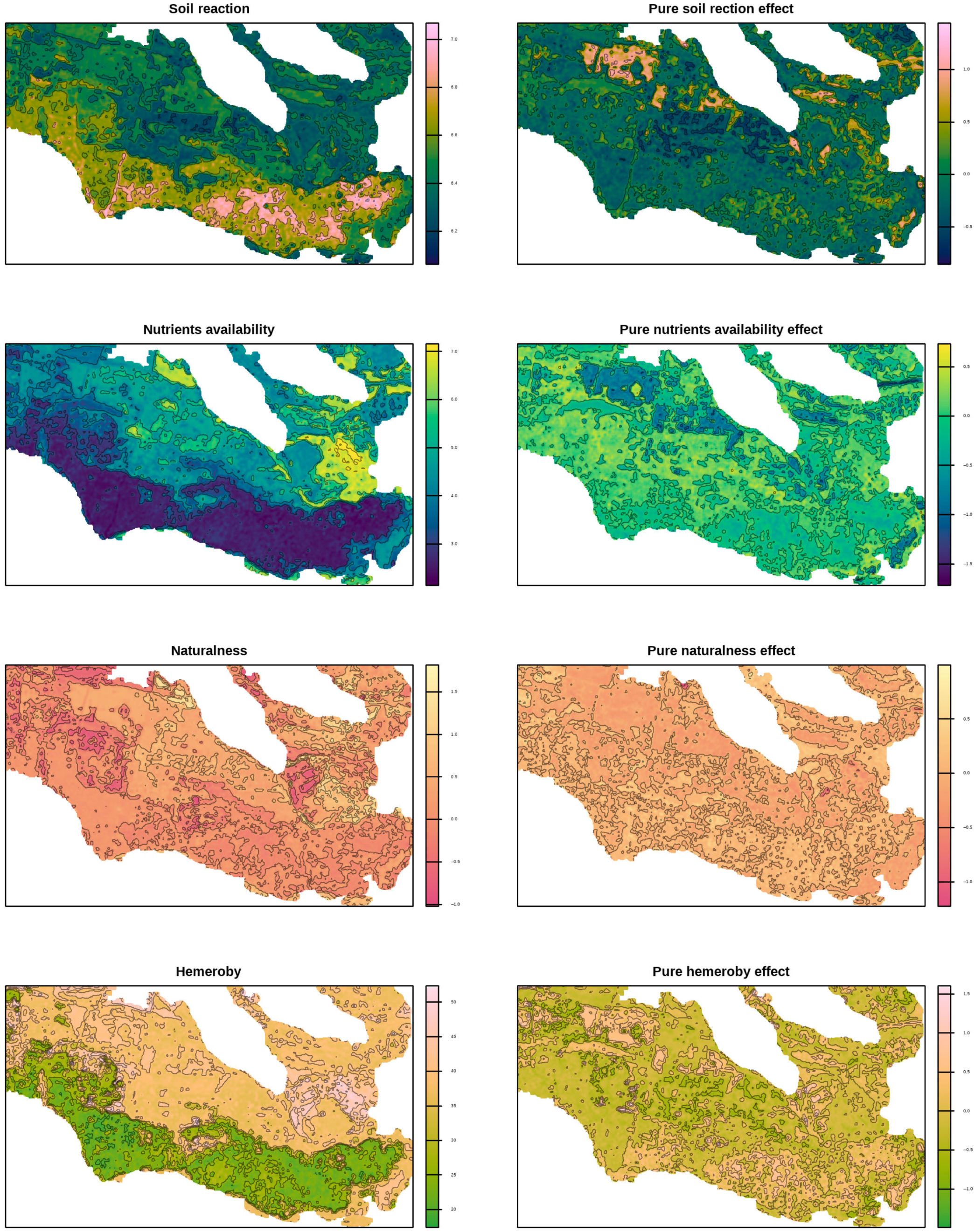 Spatial variability of environmental factors based on the Ellenberg indicator system, naturalness, and hemeroby predicted by a random forest using Sentinel-derived spectral indices (left panel) and their pure effects (right panel).
