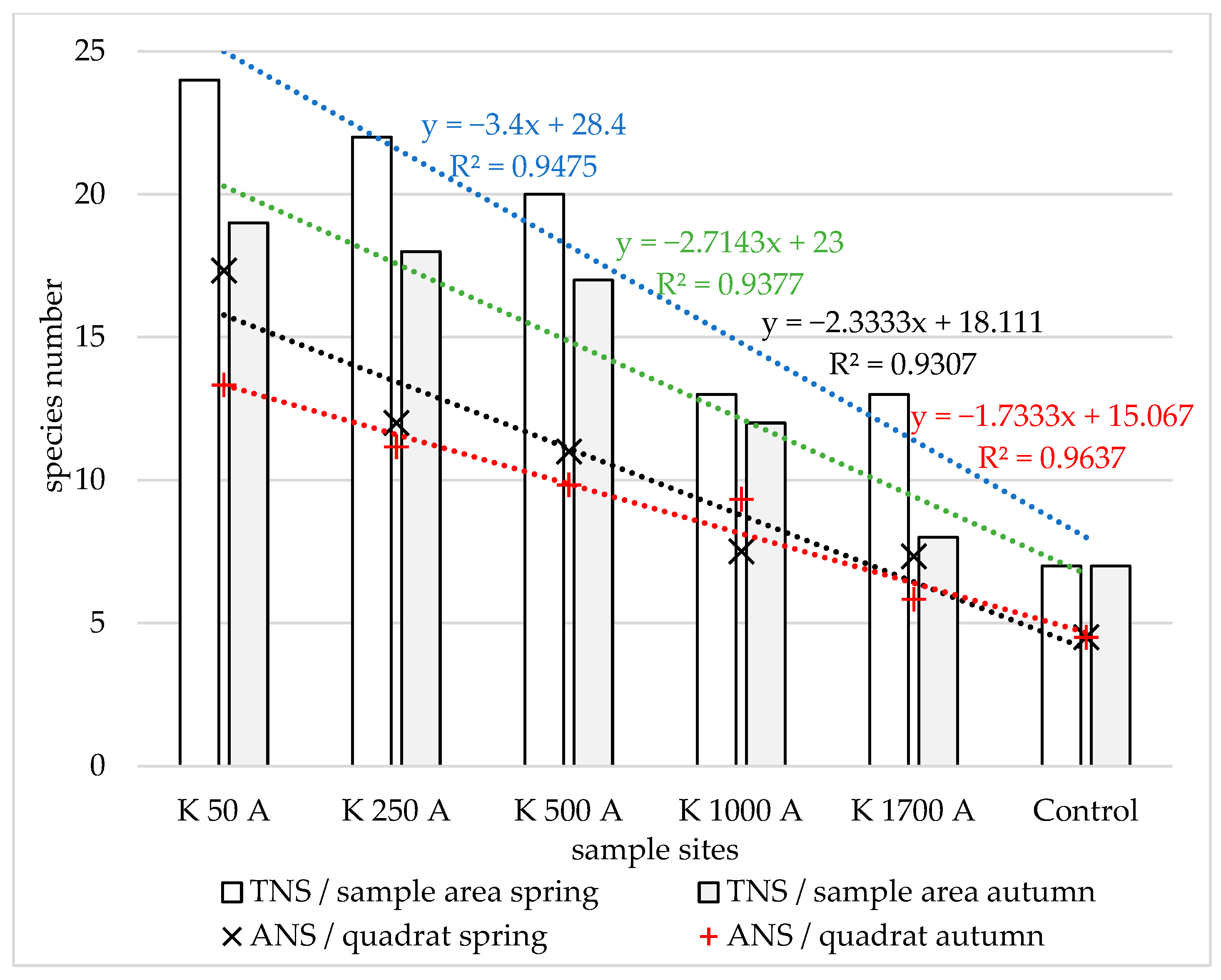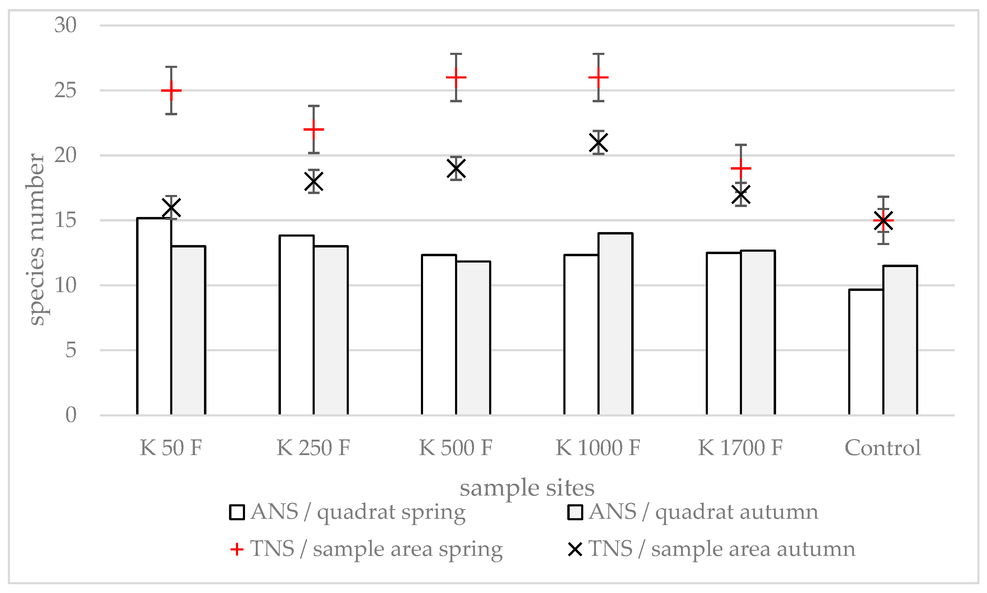 3.1. Compositional Homogeneity, Species Numbers per Quadrat and per Habitat