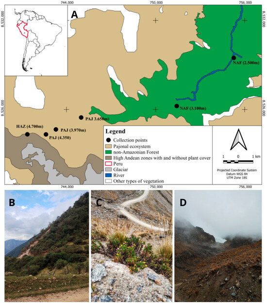 Location of study areas. (A). Study area and collection points in the Cuzco department, southern Peru. (B). Non-Amazonian forest area. (C). Pajonal ecosystem area. (D). High Andean zones with and without plant cover.