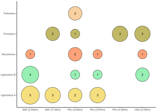 The myxomycete species richness observed in this study decreases with increasing altitude, likely due to more extreme environmental conditions such as lower temperatures, lower humidity, higher UV radiation, and the scarcity of woody substrates, essential for many lignicolous species. In the Andean Altiplano (4700 m), 50% of the species (D. circumdissiliens, L. tenera, and P. luteola) are fimicolous, occurring in Viscacha (Lagidium peruanum) dung, while D. leucopodia was found on mosses. At this altitude, two strictly lignicolous species (H. calyculata and O. favogineum) were found in a single fragment of a dead branch. Some authors comment that herbivore feces, in general, are not a very productive substrate [32,33], with open environments such as deserts and grasslands being the most notable exceptions. Diversity in this substrate appears to be associated with cold, dry climates, where prevailing conditions slow fecal decomposition [34,35,36,37,38].