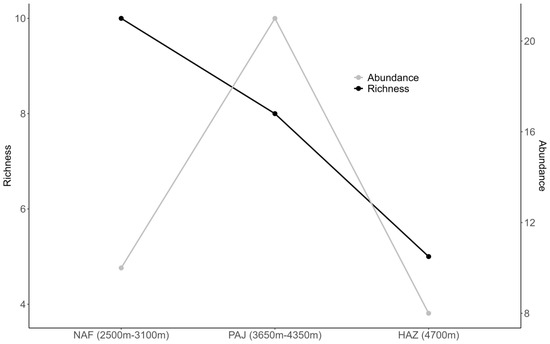 When accounting for recorded species according to vegetation type and altitude, it is observed that richness decreases as altitude increases, and tree and shrub vegetation becomes scarce. The NAF areas (2500 m–3100 m) have 10 species, while the PAJ areas (3650 m–4350 m) have eight species, and HAZ (4700 m) only five species. Abundance remains relatively similar in NBA and AAA, with 10 and eight specimens, respectively, and 21 specimens in the PAJ areas (Figure 4).