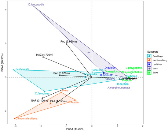 Principal component analysis (PCA) reveals a strong distinction in the myxobiota of NAF (2500 m) compared to the other sites. Although NAF (3100 m) has a similar floristic composition, its myxomycete community is more closely related to that of higher altitude areas. A clear division is observed between the ecological groups of myxomycetes, according to substrates: fimicolous, muscicolous and lignicolous. The three fimicolous species, D. circumdissilens, L. tenera, and P. luteola, are strongly associated with environments in NAF (3100 m) and PAJ (4350 m). A. cinerea, A. cf. marginondulata, B. polycephala, C. leucocephalum, D. melanosporum and H. serpula are more related to the NAF environment (2500 m), which has forest, but at lower altitudes (Figure 5).