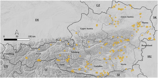 Map of Austria with bumblebee sampling localities. The nine federal states of Austria are indicated by their names. CH, Switzerland; DE, Germany; HU, Hungary; IT, Italy; SK, Slovakia; SI, Slovenia.