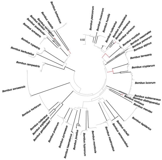 Neighbor joining tree of Austrian bumblebees, based on 583 COI barcodes with a length of 425 bp to 658 bp. Branches with bootstrap support of <80, 80–95 and >95 are indicated in light grey, red and black, respectively.