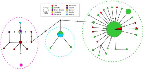 - Leigh, J.W.; Bryant, D.; Nakagawa, S. POPART: Full-feature software for haplotype network construction. Methods Ecol. Evol. 2015, 6, 1110–1116. [Google Scholar] [CrossRef]