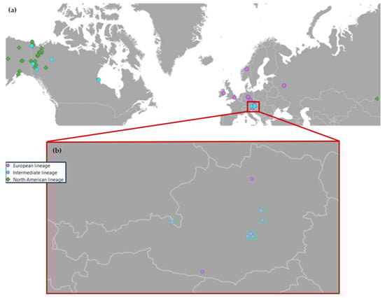 Maps showing the geographic distribution of Bombus jonellus. DNA barcodes obtained from the BOLD database and from Austria. Sample points are colored according to their assigned genetic lineage: green diamonds indicate the North American lineage, pink dots correspond to the European lineage, and turquoise dots represent the intermediate lineage. (a) Global map showing the worldwide sampling locations (of DNA barcodes with a length >605 bp). (b) Map focused on sampling locations within Austria (samples for which DNA barcodes were newly generated in this study).