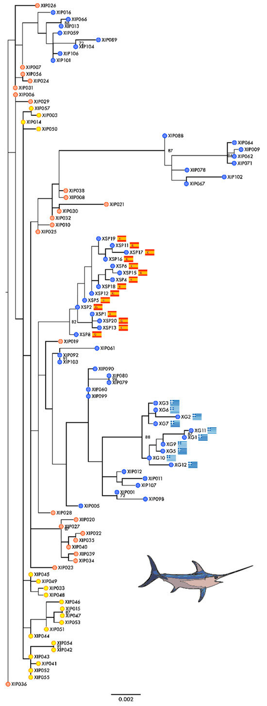 Maximum likelihood unrooted tree representing phylogenetic relationships among Xiphias gladius concatenated mitochondrial sequences. Maximum likelihood tree showing the relationships among X. gladius COI, ND2, and CytB concatenated sequences. Bootstrap support values at nodes are only shown when above 70. Atlantic samples are displayed with red dots. Samples from the Indian Ocean are represented by yellow dots. Mediterranean samples are shown with blue dots. Among the Mediterranean samples, Spanish and Greek samples additionally featured their respective flags to represent their defined sampling location.
