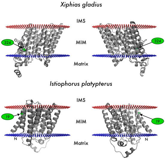 Mapping of the positively selected amino acid residues (indicated in green) in the 3-dimensional obtained models for swordfish Xiphias gladius and Istiophorus platypterus ND2 protein. MIM, mitochondrial inner membrane; IMS, intermembrane space; N, amino-terminal tail; C, carboxy-terminal tail. Numbers and arrows indicate codon positions.