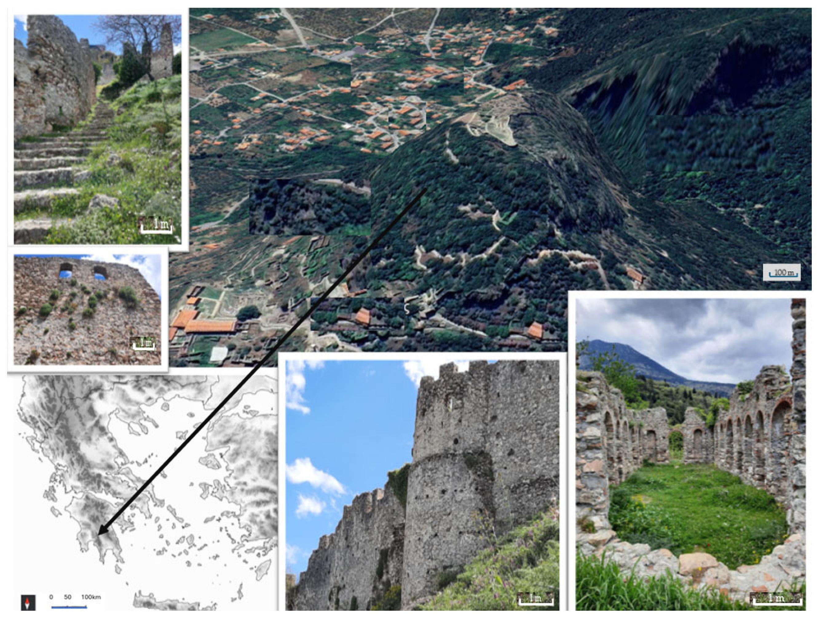 - Panitsa, M.; Trigas, P.; Kontakos, D.; Valli, A.T.; Iatrou, G. Natural and Cultural Heritage Interaction: Aspects of Plant Diversity in Three East Peloponnesian Castles (Greece) and Conservation Evaluation. Plant Biosyst. 2022, 156, 538–552. [Google Scholar] [CrossRef]