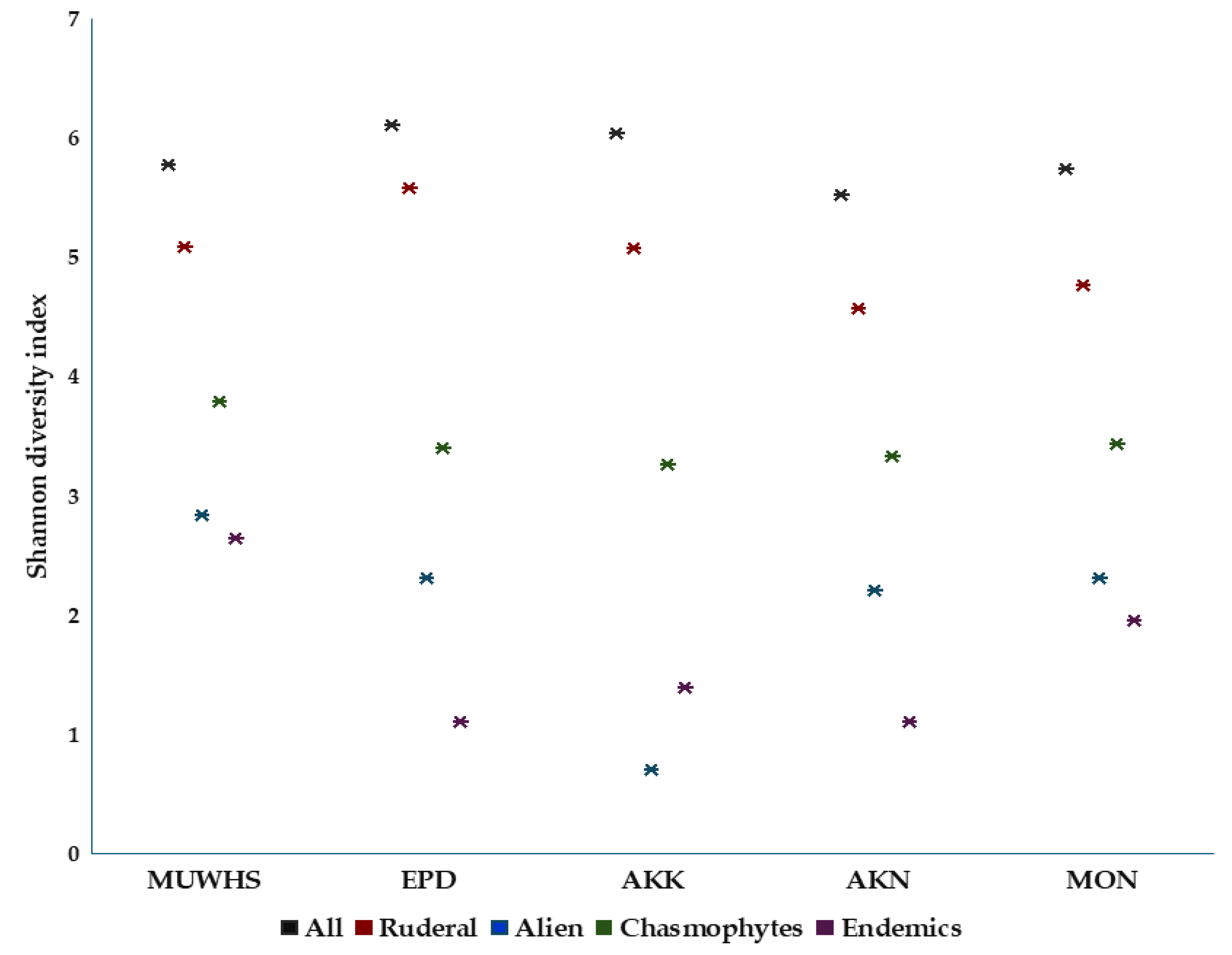 - Petersen, T.K.; Speed, J.D.M.; Grøtan, V.; Austrheim, G. Competitors and Ruderals Go to Town: Plant Community Composition and Function along an Urbanisation Gradient. Nord. J. Bot. 2021, 39, e03026. [Google Scholar] [CrossRef]