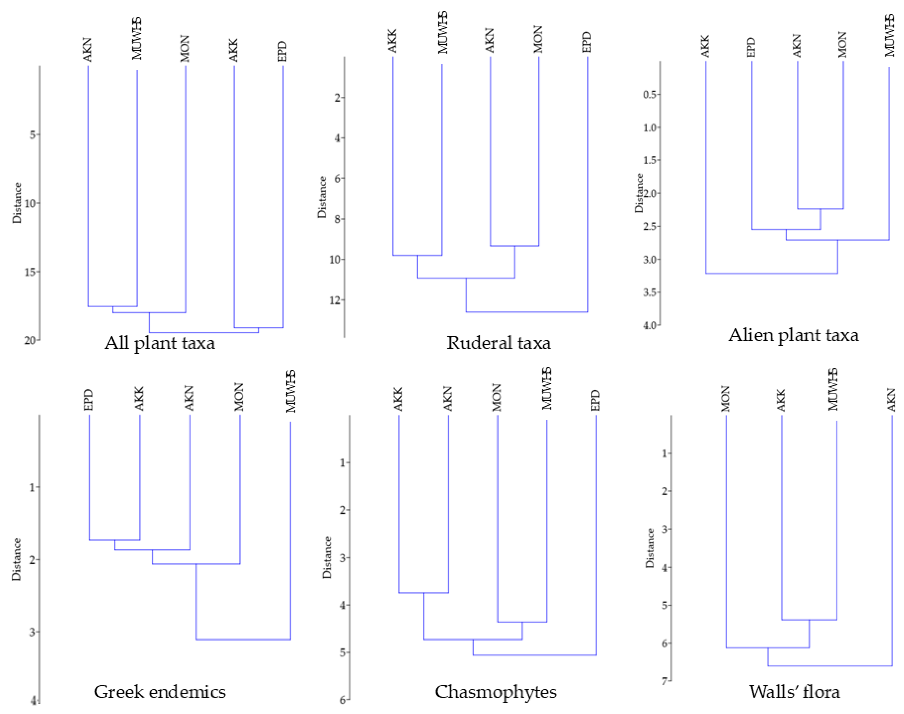 - Panitsa, M.; Iliadou, E.; Kokkoris, I.; Kallimanis, A.; Patelodimou, C.; Strid, A.; Raus, T.; Bergmeier, E.; Dimopoulos, P. Distribution Patterns of Ruderal Plant Diversity in Greece. Biodivers Conserv. 2020, 29, 869–891. [Google Scholar] [CrossRef]