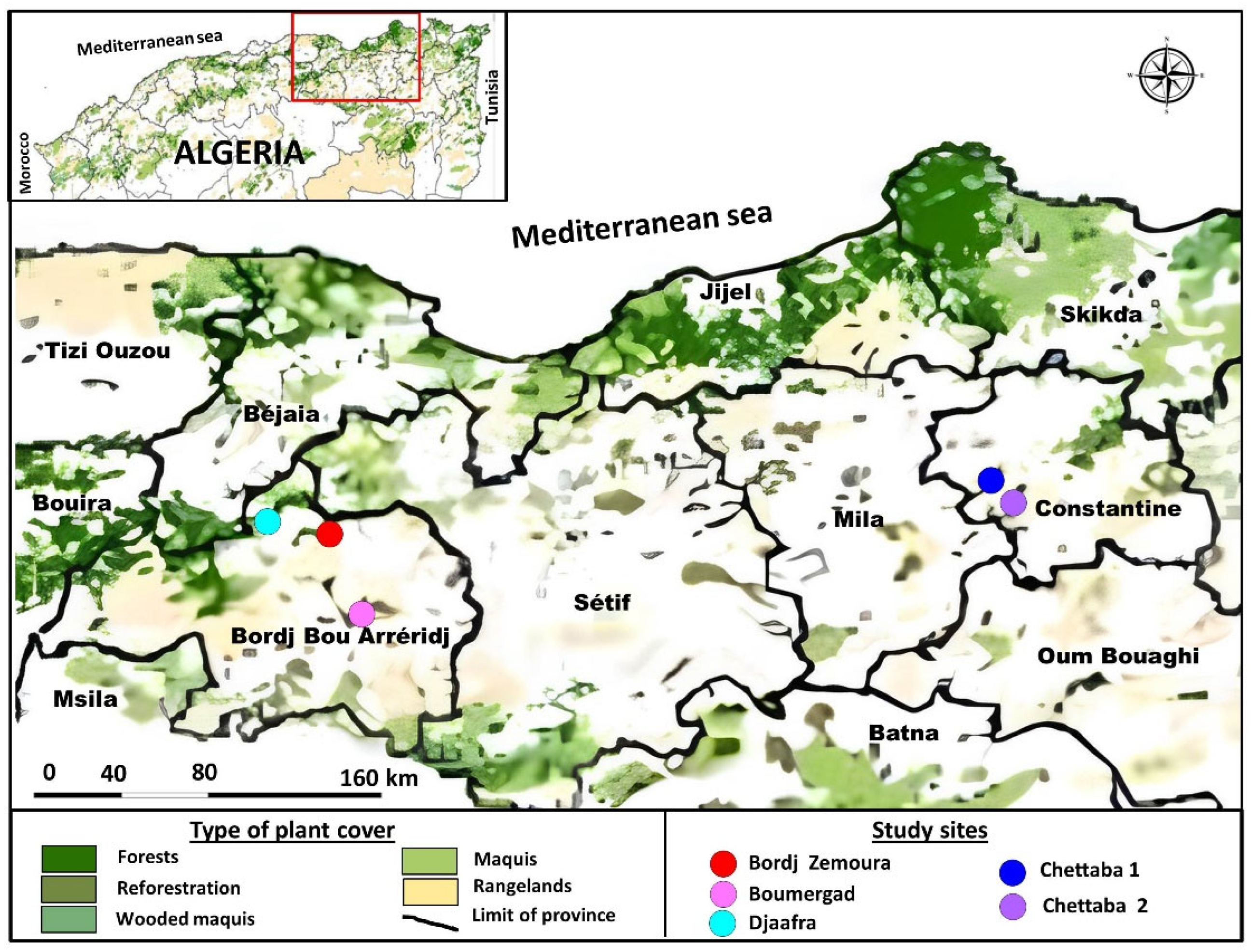 | Chettaba Aleppo Pine Forest | 36°17′57.2″ N 6°27′22.1″ E | Dense forest (0.18 tree per m2) at an altitude of 866 m, including agricultural lands. Tree height ranges from 1 to 3 m. Composed of Aleppo pine trees. |