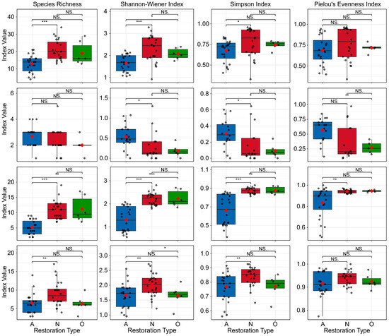 Plant species richness and α-diversity across restoration modes. Rows indicate (1) whole community, (2) trees, (3) shrubs, and (4) herbs. Restoration codes: A = active restoration, N = natural regeneration, R = reference forest. Red diamonds denote means. Asterisks indicate significance levels: * p < 0.05; ** p < 0.01; *** p < 0.001; NS, not significant (p ≥ 0.05).