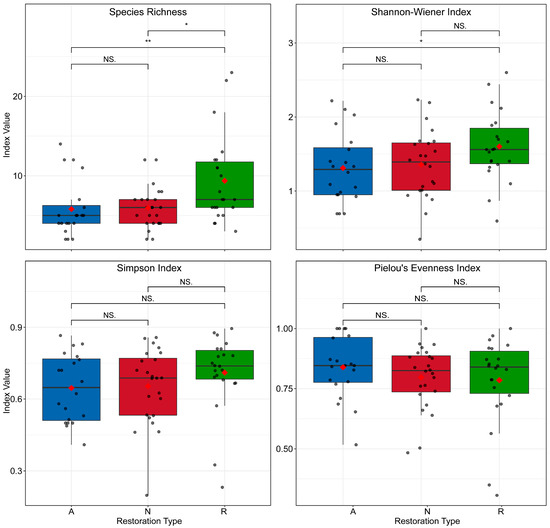 Animal species richness and α-diversity across restoration modes. Restoration codes: A = active restoration, N = natural regeneration, R = reference forest. Red diamonds denote means. Asterisks indicate significance levels: * p < 0.05; ** p < 0.01; *** p < 0.001; NS, not significant (p ≥ 0.05).