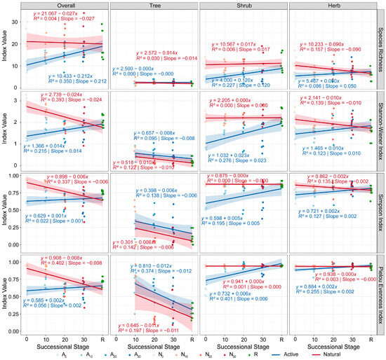 Temporal trends of plant α-diversity. Contrasting active restoration with natural regeneration revealed distinct patterns. Under active restoration, overall plant diversity, shrub diversity, and herb diversity increased with restoration age, whereas tree diversity decreased; nevertheless, all layers converged toward the reference forest. Under natural regeneration, overall α-diversity, tree diversity, and herb diversity declined while approaching the reference forest, and shrub α-diversity remained stable (Figure 5).