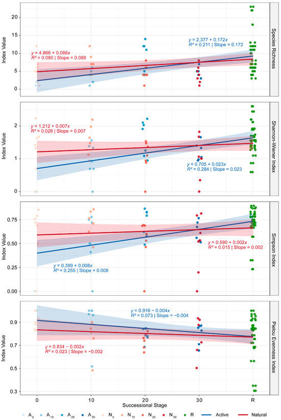 Temporal trends of animal α-diversity. Under active restoration, species richness (S), Shannon (H), and Simpson (D) increased toward the reference forest with restoration age, while Pielou’s evenness (J) decreased. Under natural regeneration, α-diversity indices showed similar directions but flatter trends (Figure 6). Taken together, these α-diversity patterns indicate that active restoration and natural regeneration follow divergent successional pathways: active restoration shows increasing diversity from a low initial state, whereas natural regeneration exhibits declining diversity from an initially high baseline, with both modes converging toward reference forest conditions over time.
