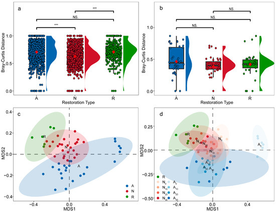 For plants, we calculated the importance value (IV) to identify dominant species under different restoration modes [27]. For animals, we quantified RAI based on independent records, which we used to identify dominant animal species in each restoration mode [28]. We assessed biodiversity using species richness, α-diversity, and β-diversity. α-Diversity included the Shannon–Wiener index (H), Simpson’s diversity (D), and Pielou’s evenness (J) [29]. β-diversity was measured by the Bray–Curtis dissimilarity index (BCd) (Table 1), where larger values indicate lower compositional similarity and thus higher β-diversity [30]. We used the Kruskal–Wallis test to compare overall α- and β-diversity among active restoration, natural regeneration, and reference forest, followed by Mann–Whitney U tests for pairwise differences [31]. We then fitted linear regressions of α-diversity against restoration age to infer successional trends. Finally, we used the vegan and ecodist packages in R to perform non-metric multidimensional scaling (NMDS) and evaluate β-diversity relationships among the three modes [32] and applied permutational multivariate analysis of variance (PERMANOVA) to test for group differences.