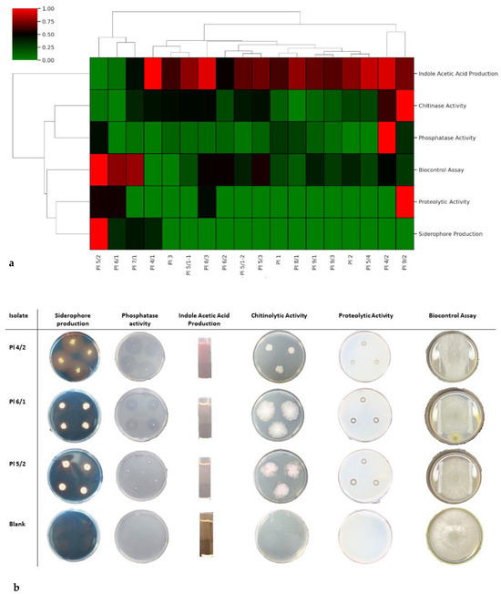 Results of the in vitro assay: (a) heatmap analysis derived from the in vitro data; (b) visual representations of the in vitro tests for the most successful bacterial strains.