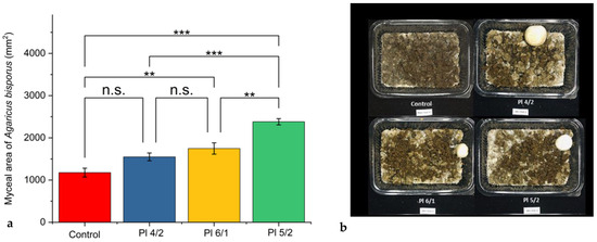 In vivo assay results: (a) mycelial growth of Agaricus bisporus; (b) comparative images of the applications (n.s. = not significant; **: p ≤ 0.01; ***: p ≤ 0.001).