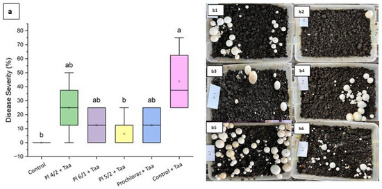 Field trial results under mushroom cultivation conditions: (a) A. bisporus field trial, characters with the same letter value are statistically insignificant according to the Tukey test, which was conducted with 95% confidence; (b1) control, (b2) control with Taa, (b3) treatment Pl 4/2 with Taa, (b4) treatment Pl 6/1 with Taa, (b5) treatment Pl 5/2 with Taa, and (b6) treatment Prochloraz with Taa.
