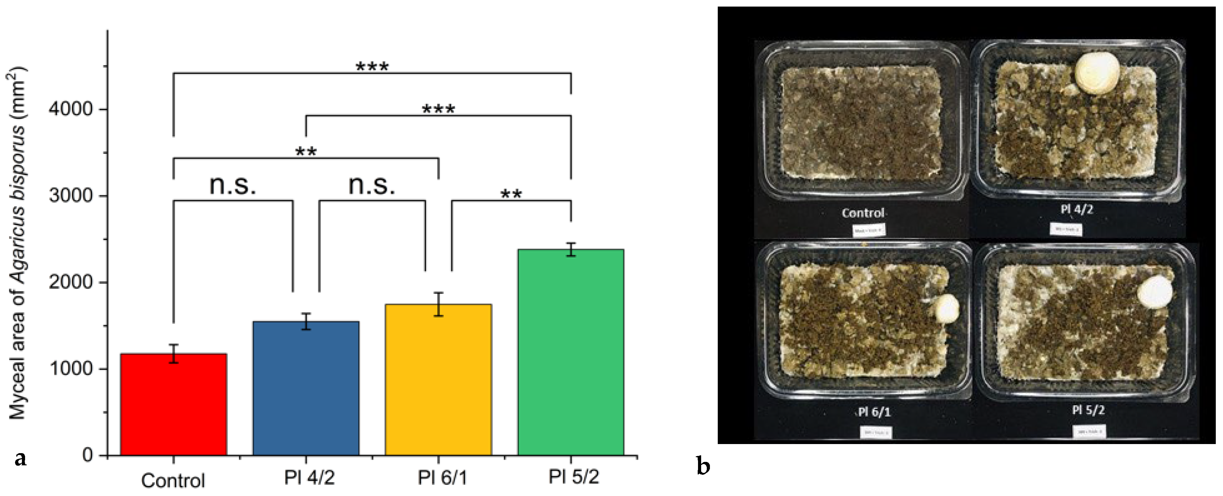 - Cetin, M.; Atila, F.; Eren, E. Valorization of Olive Press Cake as a Sustainable Alternative to Peat in White Button Mushroom (Agaricus bisporus) Cultivation. Biomass Convers. Biorefinery 2025, 15, 20589–20599. [Google Scholar] [CrossRef]