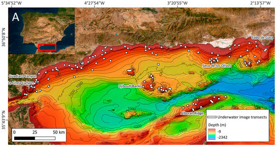 - Rueda, J.L.; Gofas, S.; Aguilar, R.; de la Torriente, A.; García Raso, J.E.; lo Iacono, C.; Luque, Á.A.; Marina, P.; Mateo-Ramírez, Á.; Moya-Urbano, E.; et al. Benthic Fauna of Littoral and Deep-Sea Habitats of the Alboran Sea: A Hotspot of Biodiversity. In Alboran Sea—Ecosystems and Marine Resources; Báez, J.C., Vázquez, J.-T., Camiñas, J.A., Malouli Idrissi, M., Eds.; Springer International Publishing: Cham, Switzerland, 2021; pp. 285–358. [Google Scholar]