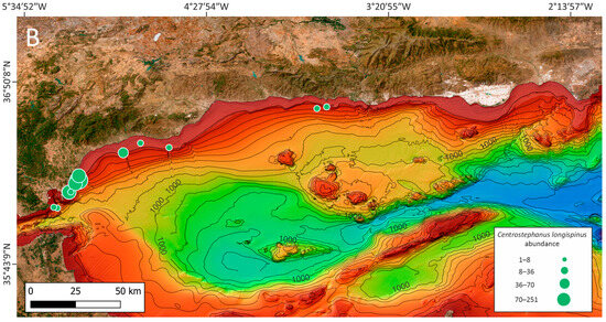 Despite the fact that C. longispinus is widespread throughout the Mediterranean [6,28], the densities recorded in the present study, and more specifically at the eastern Strait of Gibraltar, have been observed to be the highest to date. This finding is in accordance with the species distribution model developed by [8]. The Strait of Gibraltar is a transition zone between the Atlantic Ocean and the Mediterranean Sea and is exposed to complex and strong hydrodynamic conditions [89,90,91]. The interaction of water masses together with wind dynamics produces upwelling processes, which contribute to a process of fertilisation of the coastal zone, increasing the production and food supply for larger trophic components and key benthic structuring species of the ecosystem [92]. These peculiar environmental conditions, with the supply of nutrients, could contribute to the development of populations of suspension feeders and of organisms that may benefit from food particle fluxes [93]. Moreover, planktotrophic larvae could benefit from the flux of these particles, resulting in a significant recruitment for some species [94]. It should be noted that the influence of Atlantic water currents could increase the larval abundance, and the western Atlantic gyre may act as a hydrodynamic trap, keeping the larvae close to the coast [95]. The high density values detected around the northern Strait of Gibraltar and western Alboran Sea, with a high presence of small-size individuals, may support this hypothesis, suggesting that this sector could potentially constitute an important reproductive hot spot for C. longispinus in the Mediterranean Sea, even though the species is widespread throughout the basin. Further and similar studies obtaining density estimations of C. longispinus across the Mediterranean and eastern Atlantic may be helpful for detecting other important hotspots for this species.