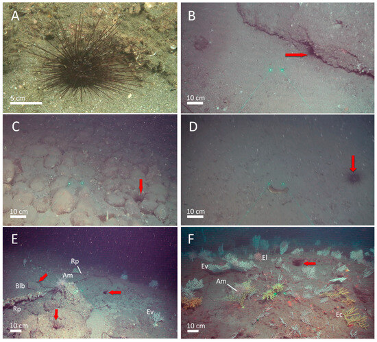Centrostephanus longispinus individuals were mainly detected in two habitat types, classified based on their resemblance to those of the “Lista Patrón de Hábitats Marinos” (LPHM) (Marine Spanish Habitats List) present in Spain [72], the Barcelona Convention (BC), and EUNIS classifications [73,74]. These were (1) infralittoral and circalittoral cobbles and gravels (LPHM 030401; BC: MC4.5 Mediterranean circalittoral mixed sediments; EUNIS: A5.4—sublittoral mixed sediments) and (2) non-concretionary circalittoral rock dominated by invertebrates with Eunicella verrucosa (Pallas, 1766) (LPHM 0302022304; BC: MC1.519 circalittoral rock with dominance of invertebrates with Eunicella verrucosa; EUNIS: A4.26—Mediterranean coralligenous communities moderately exposed to hydrodynamic action). Among the species detected with the hatpin urchin, the most dominant ones were generally gorgonians (E. verrucosa, Eunicella cavolini (Koch, 1887) and Eunicella labiata (Thomson, 1927)), the ophiuroid Astrospartus mediterraneus (Risso, 1826), and several unidentified encrusting and globular sponges (Figure 2).