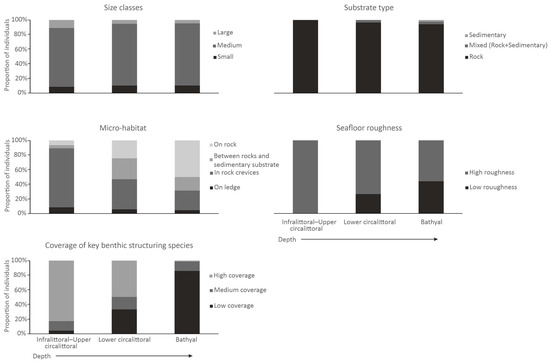 Regarding seafloor roughness, proportions of individuals in areas with low seafloor roughness were significantly higher in the lower circalittoral and bathyal strata than in the infralittoral and upper circalittoral (Z < −3.21; p < 0.005 in all comparisons) (Figure 3). Conversely, the proportion of individuals in areas with high seafloor roughness was significantly higher in the infralittoral and upper circalittoral than in both the lower circalittoral and bathyal strata (Z > 3.21, p < 0.005 in all comparisons).