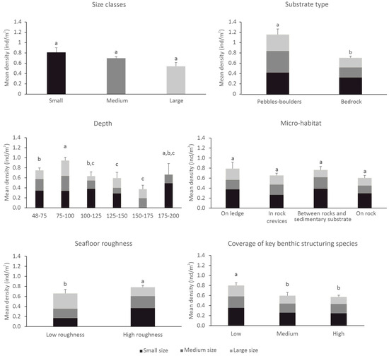 Density of Centrostephanus longispinus (individuals/m2) in infralittoral, circalittoral, and bathyal bottoms of the northern Strait of Gibraltar and Alboran Sea in relation to different size classes, depth strata, main substrate types, micro-habitats, seafloor roughness and coverages of key benthic structuring species. Different letters indicate significant differences obtained in pair-wise comparisons using the non-parametric U Mann–Whitney test (p < 0.05). Mean ± standard error. Contribution of the different size classes of C. longispinus are also represented: small (1/3 of the maximum size), medium (2/3 of the maximum size), and large (2/3–3/3 of the maximum size), with the maximum size of the test diameter being 6 cm, as stipulated in [2].