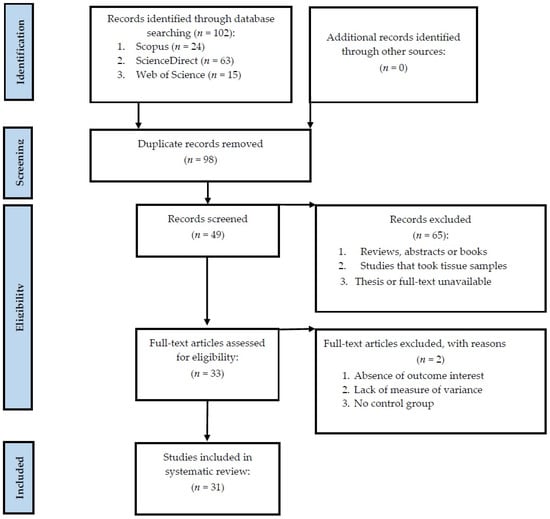 In the present comprehensive review, we used the Population (P), Intervention (I), Comparison (C) and Outcome (O) format proposed by [7] to formulate the research question. Briefly, P was mammalian animals, I was genetic variability, C was the use of invasive and non-invasive techniques for tissue procurement, and O was the reported information on heterozygosity, inbreeding coefficients, and level of genetic variability in terrestrial mammalian animals. The present systematic review followed the Preferred Reporting Items for Systematic Reviews and Meta-Analyses (PRISMA) guidelines [8]. Eligible published scientific articles were identified through Web of Science, Scopus and ScienceDirect databases. Boolean operators (AND and OR) were used to search for articles. The keyword string syntax was (“non-invasive sampling” OR “invasive sampling” OR “animal tissue”) AND (“mammals” OR “wildlife” OR “wild animals”) AND (“genetic variability” OR “inbreeding coefficients” OR “heterozygosity”). For up-to-date information, this systematic review only considered studies published between January 2014 and April 2025 and written in English.