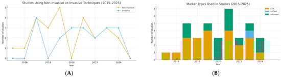 (A) Studies using non-invasive versus invasive techniques per year (2015–2025); (B) marker types used per year. Values reflect counts of unique studies per calendar year; studies classified as “both” contribute to both non-invasive and invasive tallies. Notes: Technique categories—non-invasive (e.g., faeces/scat, hair, saliva/chews, urine, environmental DNA), invasive (e.g., blood, tissue, muscle, skin, bone, biopsy), and “both” when a study reported samples from both groups. Marker categories—STR (microsatellites), mtDNA (e.g., COI, cytochrome b, D-loop, 12S), SNP/NGS (e.g., SNP panels, ddRAD/RAD, GT-seq, hybrid capture), and other/unspecified for markers not mapping to the above.