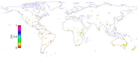 Based on the dataset of leaf size samples extracted from the published dataset [20], the global distribution of LLSD was quantitatively derived, as shown by the global map of 504 CVI sample sites in Figure 1. Across the range of calculated CVI values, most of the sampling sites exhibit relatively lower CVI magnitudes.