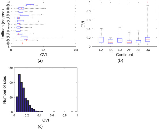 (a) Boxplot of the derived CVI values along with latitude; (b) boxplot of the CVI values for the six continents: North America (NA), South America (SA), Europe (EU), Africa (AF), Asia (AS), and Oceania (OC). (c) Histogram of the numbers of sampling sites for the derived CVI values.