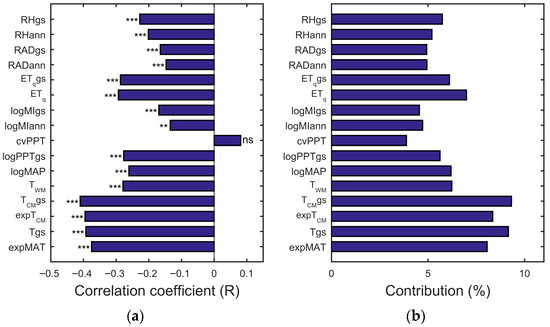 (a) The correlation coefficients between the derived CVI values and the 16 climate factors and (b) the contributions of the latter to the former. The statistical significance is indicated as follows: *** p-value < 0.001; ** 0.001 < p-value < 0.01; * 0.01 < p-value < 0.05; ns p-value > 0.05.