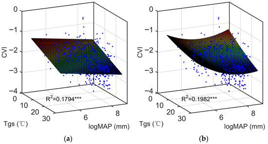 Furthermore, first-order and second-order bivariate regression analyses were made for all possible combinations of the 16 climate factors considered in the present study. Collectively, the fitting performance shows a gradual improvement. In these analyses, the combination of Tgs and logMAP is identified as the most effective predictor pair. The fitted plane and curved surface corresponding to their respective highest R2 values are shown in Figure 5a,b (0.1794 and 0.1982, respectively), representing an increase in explanatory power from 17.94% to 19.82%. In other words, the ecological predicting model corresponding to the fitted curved surface provides a slightly better explanation for the variation in CVI values. Consequently, it can be inferred that the varying climatic conditions exert a more complex influence on global LLSD patterns.