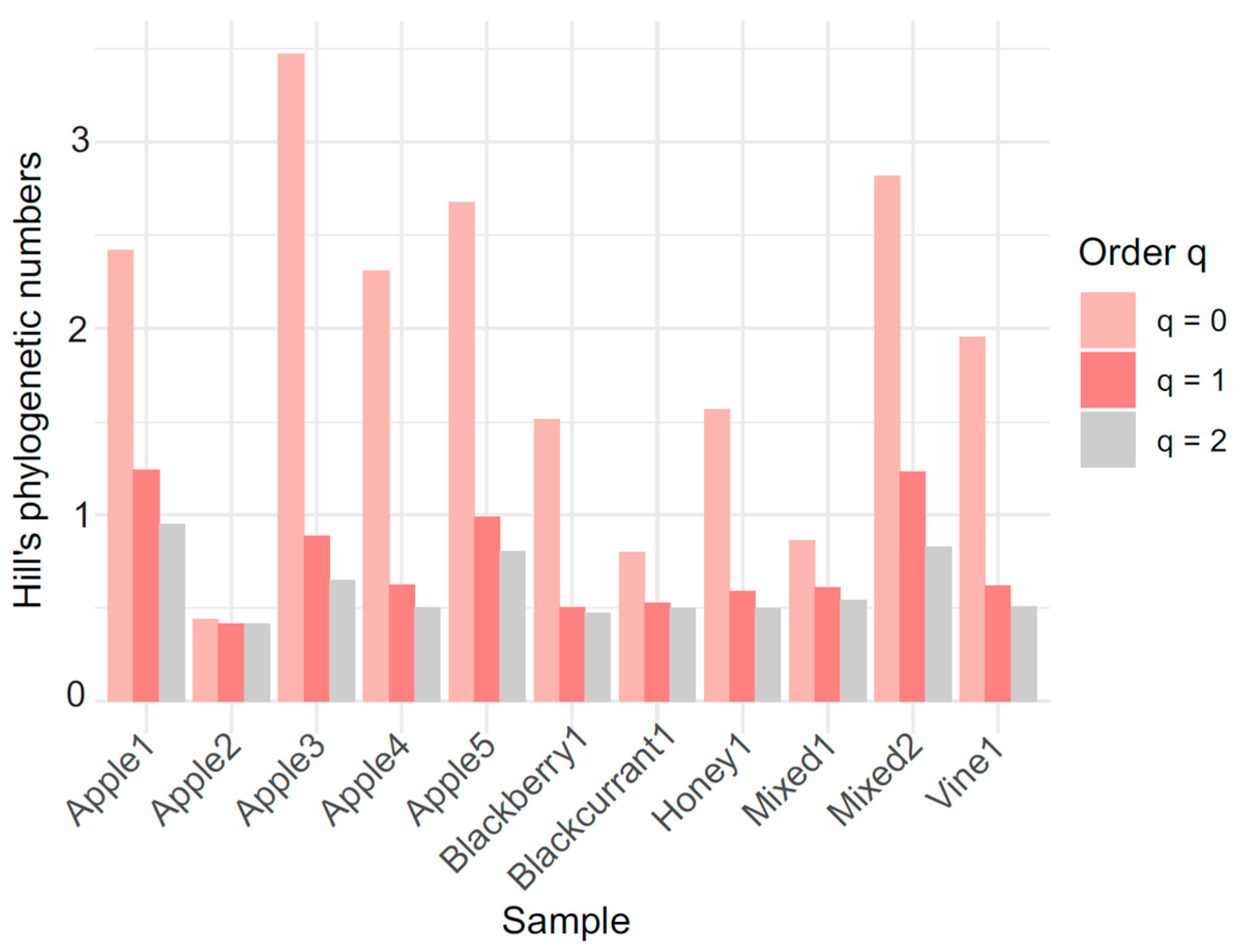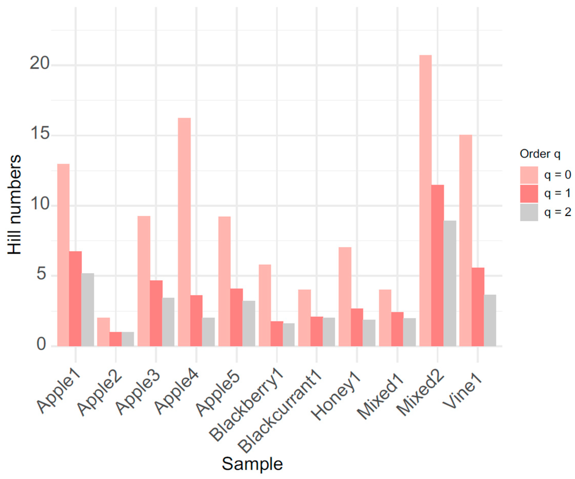 - Alberdi, A.; Gilbert, M.T.P. A Guide to the Application of Hill Numbers to DNA-Based Diversity Analyses. Mol. Ecol. Resour. 2019, 19, 804–817. [Google Scholar] [CrossRef]
