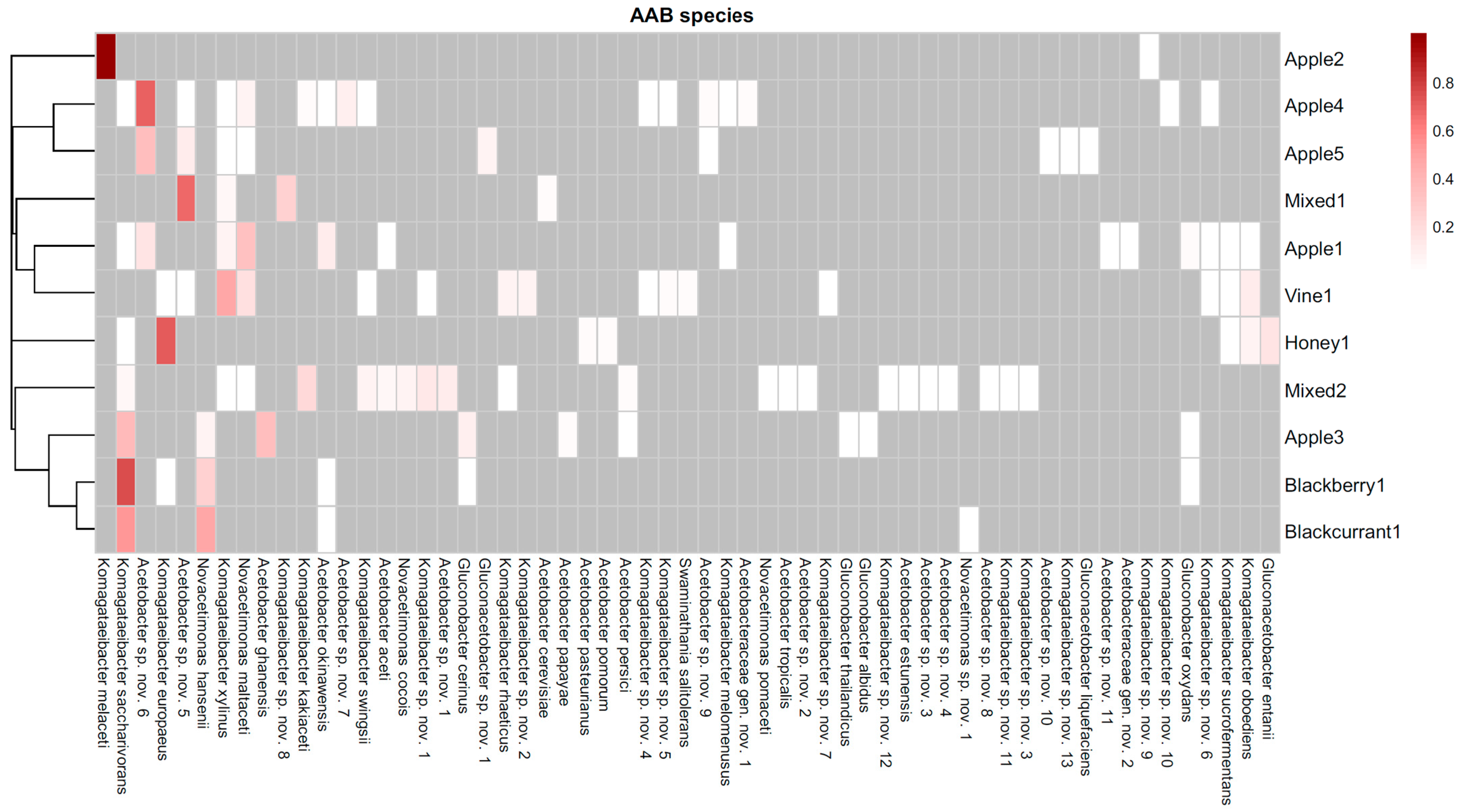- Ribič, A.; Trček, J. Customized 16S-23S rDNA ITS Amplicon Metagenomics for Acetic Acid Bacteria Species Identification in Vinegars and Kombuchas. Microorganisms 2024, 12, 1023. [Google Scholar] [CrossRef]