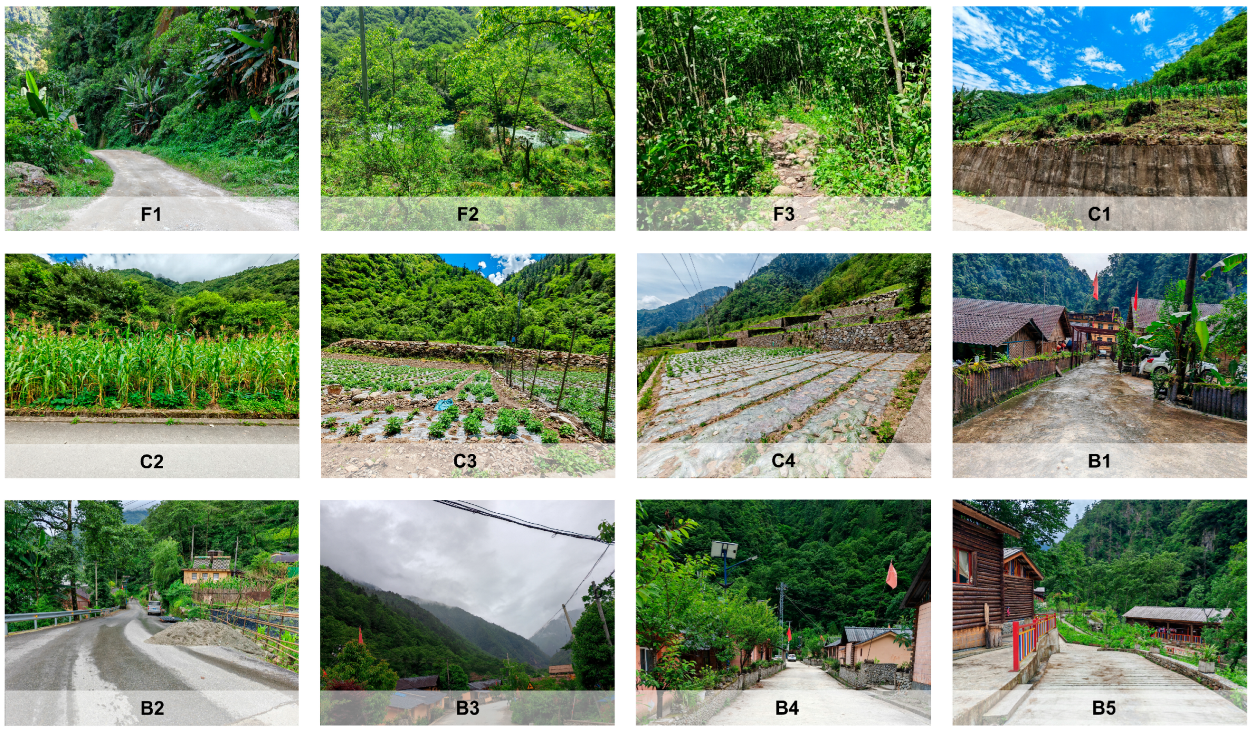 | B5 | Kelaoluo | 28.13° N, 98.30° E | 2010 | construction land | Residential settlement with significant topographic shifts. Ornamental bushes around buildings. Average canopy closure of 0.1. |