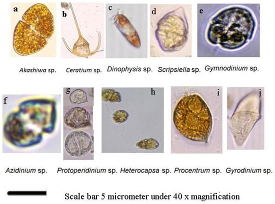 Light micrographs of different dinoflagellates. (a) Akashiwa sp.; (b) Certatium sp.; (c) Dinophysis sp.; (d) Scripiella sp.; (e) Gymnodinium sp.; (f) Azidinium sp.; (g) Protoperidinium sp.; (h) Heterocapsa sp.; (i) Procentrum; and (j) Gyrodinium sp.