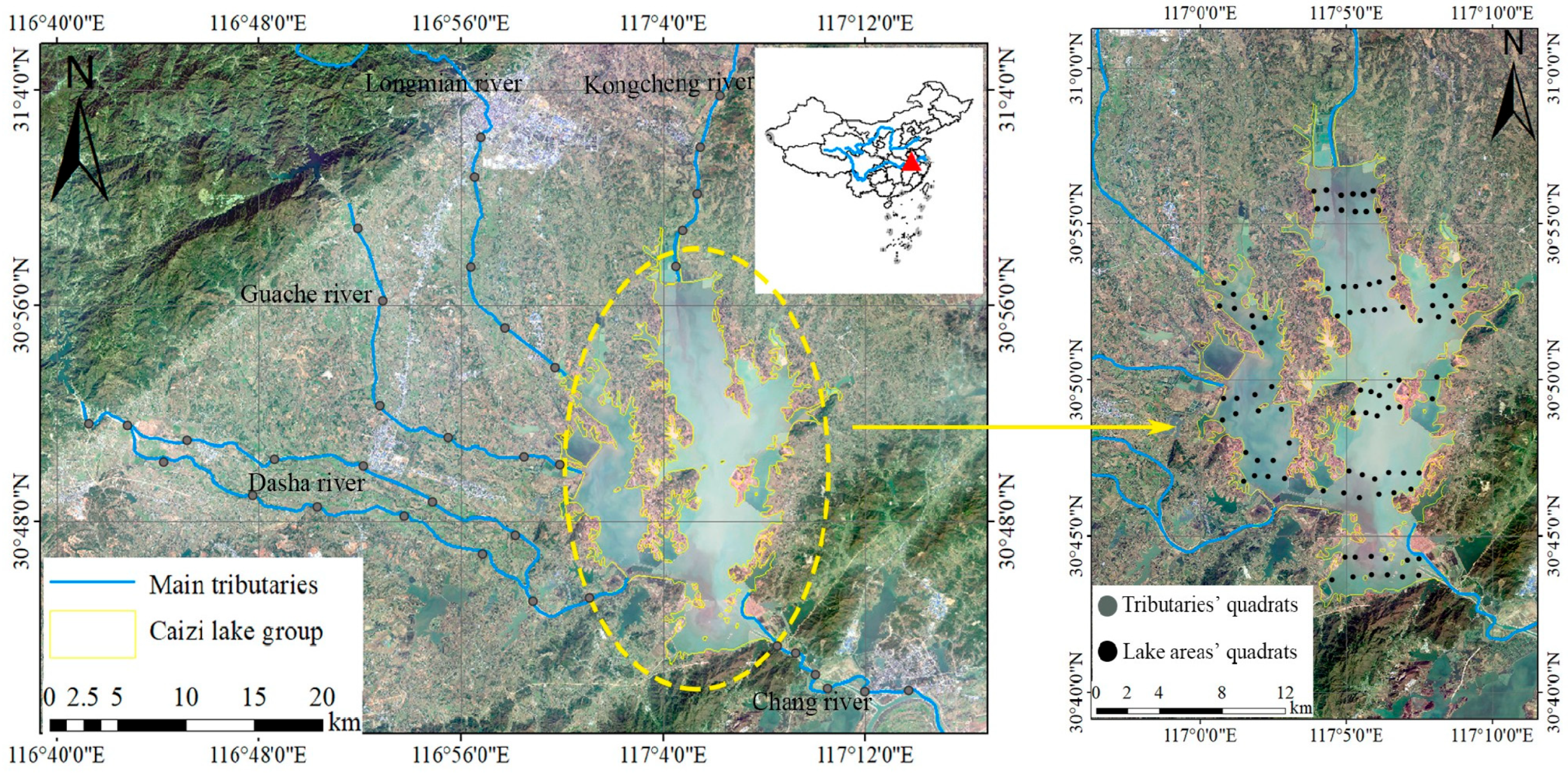The ten-year fishing ban on the Yangtze River came into effect on 1 January 2020, covering the main stream of the Yangtze River, important tributaries and large lakes connected to the river. It aims to restore aquatic biological resources and ecosystem functions by prohibiting productive fishing. The Caizi Lake Group, composed of Baitu Lake, Xizi Lake and Caizi Lake, is one of the representative shallow lakes in the middle and lower reaches of the Yangtze River. It is located on the southeast side of the Dabie Mountains and the north bank of the Yangtze River in Anqing. Since the completion of the Zongyang Gate in 1959, the Cai Zi Lake group has transitioned from a lake connected to the Yangtze River to a semi-closed lake regulated by a control gate. In 2023, a newly constructed 680 m vertical two-way fishway was installed at the Zongyang Weir on the Changhe River, part of the Caizi Lake branch of the leading water project from the Yangtze River to the Huaihe River, to facilitate the bidirectional migration of fish between the river and the lake, thereby restoring hydrological connectivity and ecological passage between the Yangtze River and Caizi Lake [21]. In 2003, the World Wide Fund for Nature (WWF) assessed Poyang Lake, Dongting Lake, and Shengjin Lake and the lakes of the Anqing Yangtze River Wetland Nature Reserve, including the Caizi Lake Group, as the three most ecologically significant wetland areas in the middle and lower reaches of the Yangtze River [22]. In addition, the Caizi Lake complex serves as a critical stopover and wintering habitat for waterbirds migrating along the East Asia-Australia Flyway. After the trial operation of the Caizi Lake Line of the Yangtze River to the Huaihe River Water Diversion Project began on 16 September 2023, in order to reduce the impact of shipping on the Caizi Lake wetland and migratory birds, navigation was prohibited in the waterways of the lake area during the wintering period of winter migratory birds. To protect the fishery resources in the Yangtze River Basin, a complete fishing ban has been implemented in the Caizi Lake Group since 2021. Historical data show that the investigation of bivalve species in the Caizi Lake Group can be traced back to 1982 at the earliest. Only eight species were recorded in the early stage, mainly Corbicula fluminea [23]. By 2020, a total of 22 species had been recorded [24,25,26,27,28]. Overall, the historical research on bivalves in this area is limited, and there is a lack of systematic investigation of the main tributaries. The environmental driving factors of the distribution pattern of bivalves have not been explored either. Therefore, the support provided for the conservation and protection management of bivalve resources in the Caizi Lake water system is still insufficient.