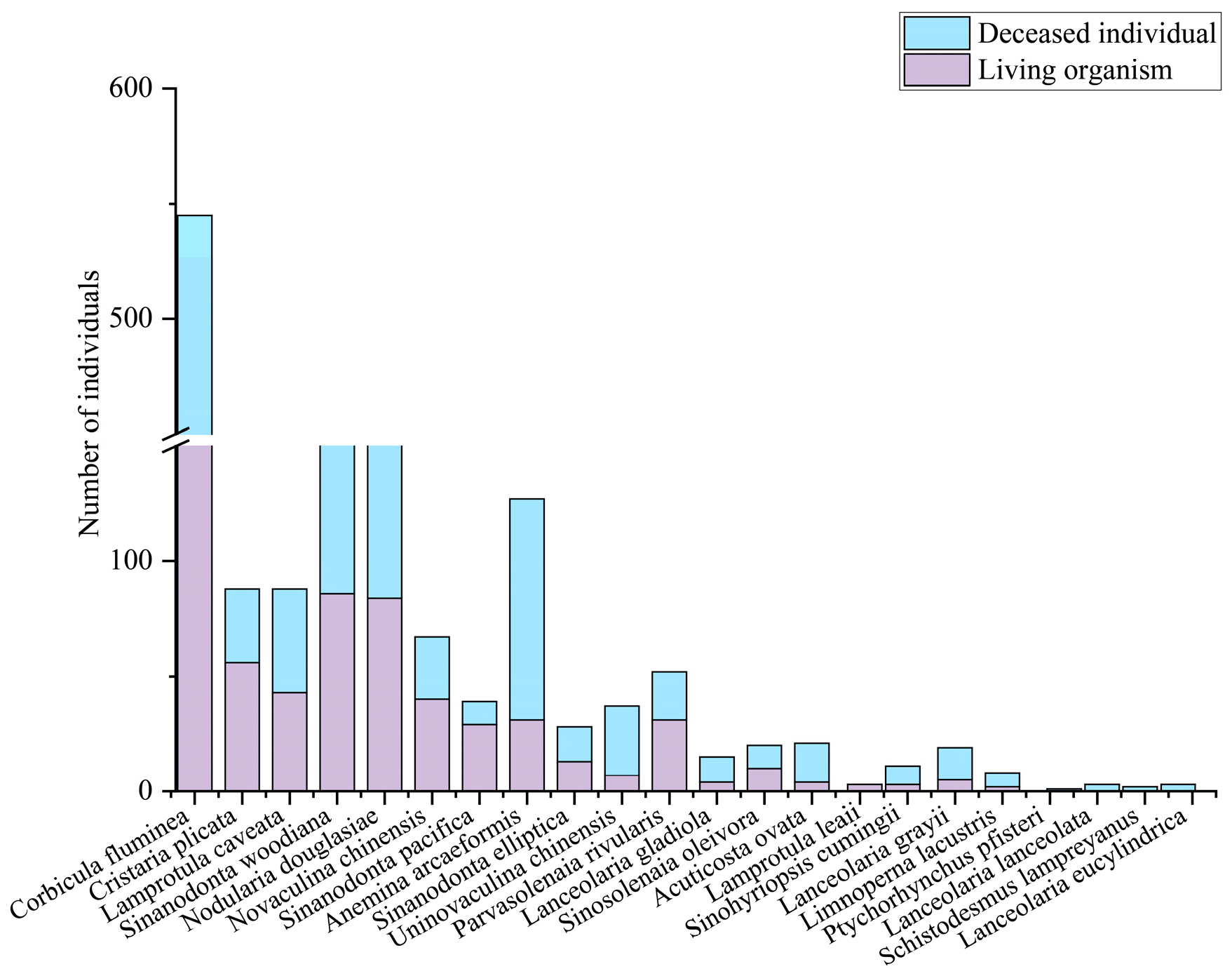 A total of 22 species of freshwater bivalves belonging to 4 families and 15 genera were collected during the survey, of which 18 species, accounting for 81.82%, were collected alive. Ptychorhynchus pfisteri, Lanceolaria lanceolata, Schistodesmus lampreyanus, Lanceolaria eucylindrica were collected only from dead individuals. In this investigation, Ptychorhynchus pfisteri, Lamprotula leaii and Uninovaculina chinensis, two species of national second-class key protected wild animals, were discovered for the first time in the Caizi Lake water system (Figure 2). Corbicula fluminea dominates in the bivalve community structure of the Caizi Lake water system (Table 1), with a quantity proportion of 43.34%.