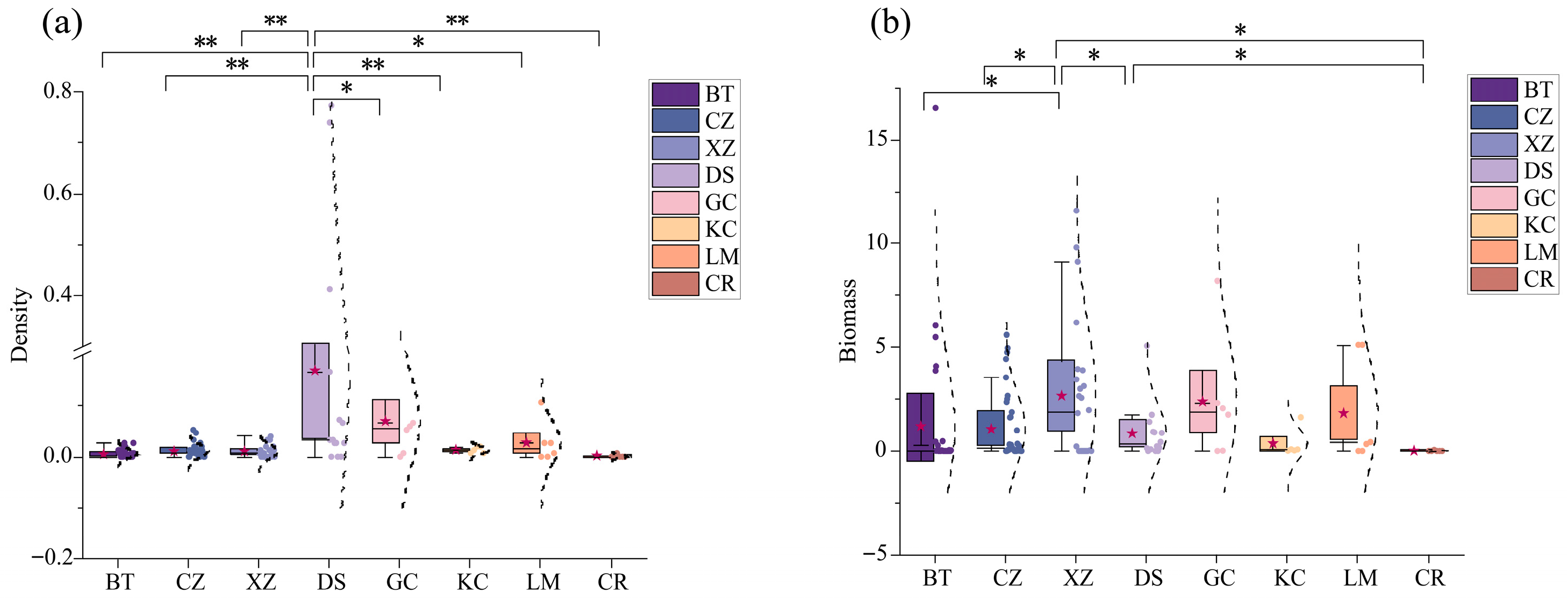 Figure 4. Spatial characteristics of bivalve density (a) and biomass (b) in the Caizi Lake water system. * indicates p < 0.05; ** indicates p < 0.001; ★ indicates the average; The thick black line indicates the median.