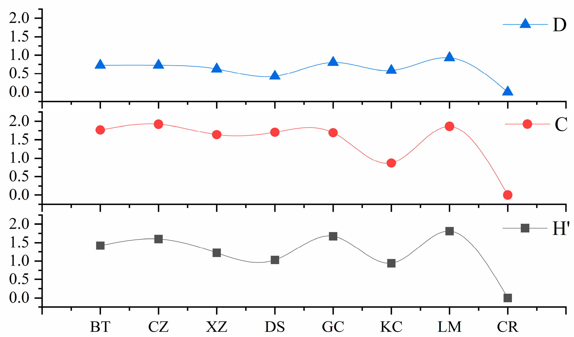 Figure 5. Species diversity index of each water area and indices of Pielou’s evenness (D), Margalef richness (C) and Shannon–Wiener (H′).