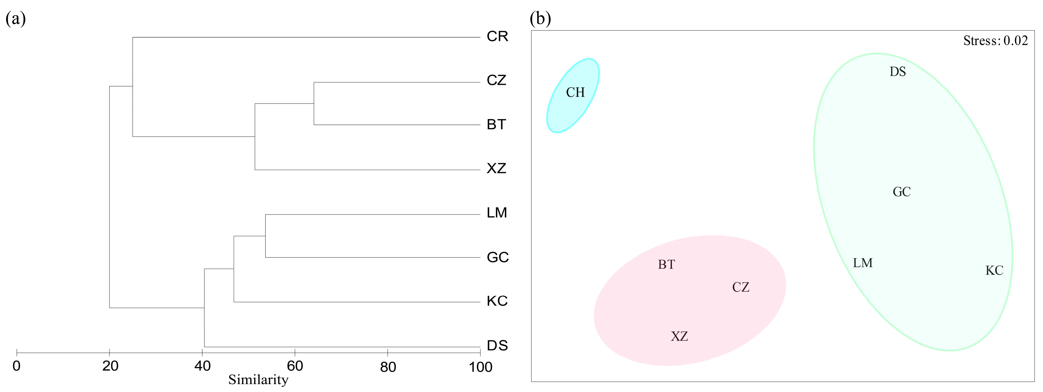 Cluster analysis of bivalve communities in eight investigated water areas shows (Figure 6a) that the bivalve community structure of the Caizi Lake water system is divided into three subgroups at a similarity level of 24.92%. The Dasha River, Kongcheng River, Guache River and Longmian River belong to Group I, the three lakes belong to Group II, and Chang River alone belongs to Group III. The stress coefficient (Stress = 0.02) confirms the exceptionally high reliability of the NMDS ordination plot [44], and the result is in strong agreement with the cluster analysis, collectively providing robust support for the conclusion that the bivalve community within the Caizi Lake water system can be classified into three significantly distinct groups (Figure 6b).