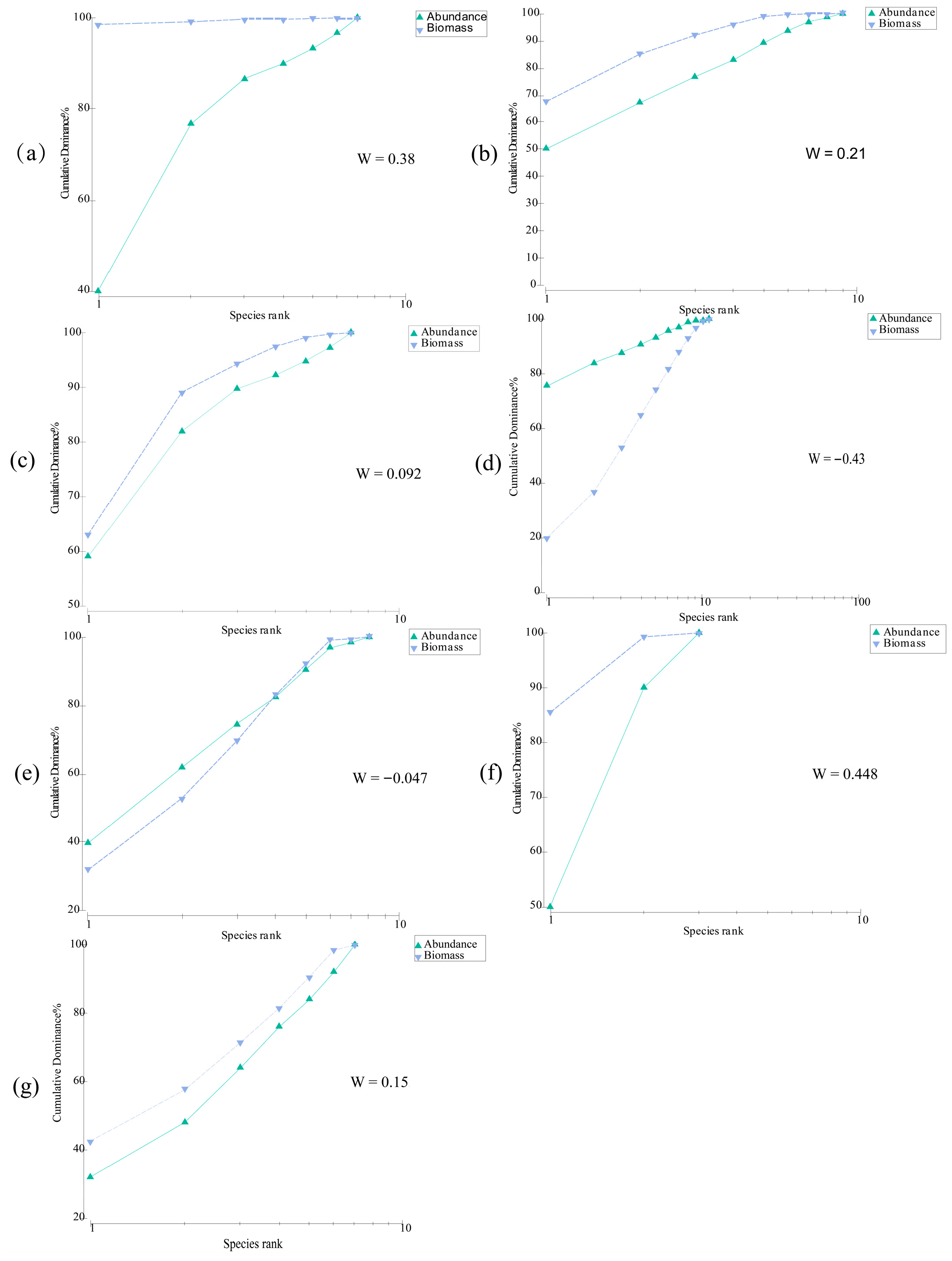 Figure 7. ABC curves of macrobenthos in Caizi lake water system: (a) Baitu Lake, (b) Caizi Lake, (c) Xizi Lake, (d) Dasha River, (e) Guache River, (f) Kongcheng River and (g) Longmian River.