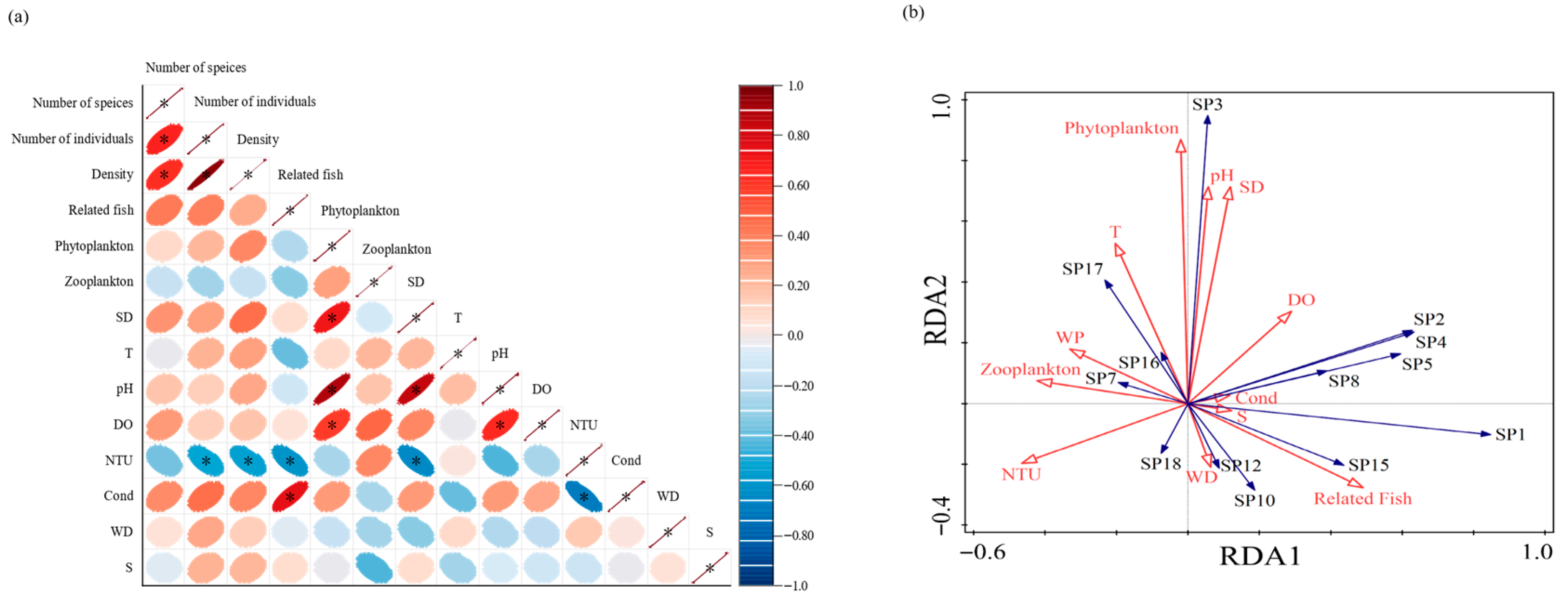 Figure 8. Correlation analysis of bivalve communities and environmental factors. (a) Spearman correlation analysis of the Caizi Lake Group and bivalve communities—environmental drivers. (b) RDA of bivalve species in the Caizi Lake Group. WP represents different water periods; SD stands for transparency; T is the water temperature; pH is the degree of acidity or alkalinity; DO stands for dissolved oxygen; NTU stands for turbidity; Cond stands for Conductivity; WD represents the water depth; S is the substrate. * indicates p < 0.05.
