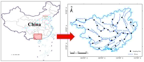 Guangxi is located in southeastern China, ranging from 104°26′ E to 112°04′ E and 20°54′ N to 26°24′ N, with a total surface area of 236,700 km2 [32]. The region has a unique karst landscape, and stone desertification areas are widely distributed, accounting for about 37.8% of the total surface area of Guangxi [33]. The average annual precipitation is above 1100 mm, and the average annual temperature is above 16 °C [34]. Although annual precipitation is abundant, its spatial and temporal distribution is uneven [35,36]. The region, an important part of the Pearl River system, has many rivers and abundant hydraulic resources. At the same time, it also covers part of the Red River system and the Yangtze River system. Surveys were carried out at 34 sites located along the main streams of major river systems in the inland waters of Guangxi: Nanpanjiang River, Hongshuihe River, Qianjiang River, Xunjiang River, Youjiang River, Zuojiang River, Yongjiang River and Yujiang River, Hejiang River, Guijiang River, Liujiang River, Nanliujiang River, and other southern rivers flowing to the sea (Figure 1).